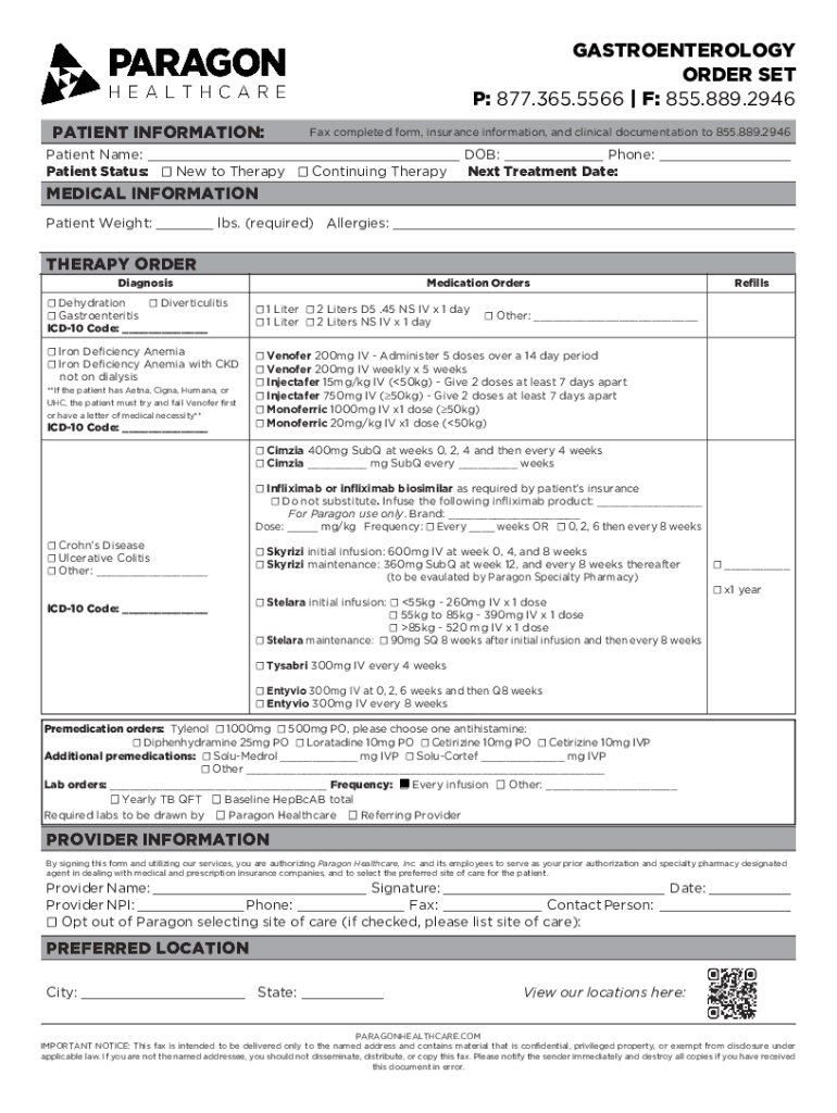 GASTROENTEROLOGY ORDER SET P: 877.365.5566 | F: 855.889.2946 PATIENT INFORMATION:Fax completed form, insurance information, and clinical documentation to 855.889.2946Patient Name: ___ DOB: ___ Phone: