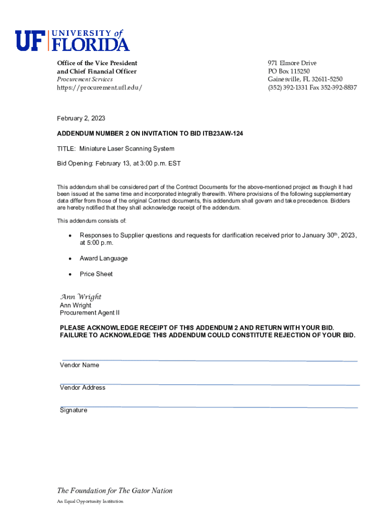 Office of the Vice President and Chief Financial Officer Procurement Services https://procurement.ufl.edu/971 Elmore Drive PO Box 115250 Gainesville, FL 326115250 (352) 3921331 Fax 3523928837February
