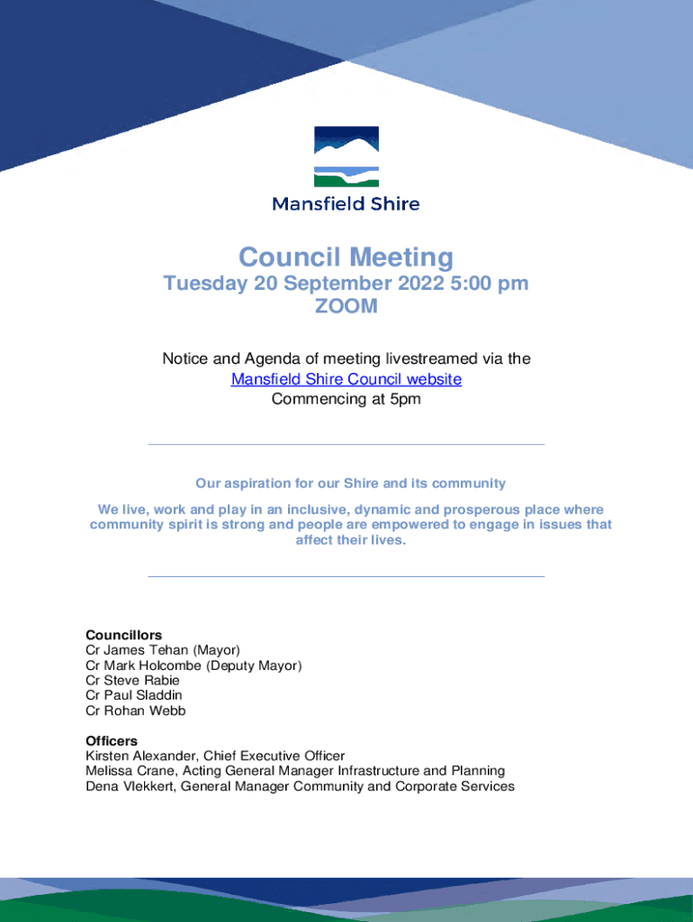 Council Meeting Tuesday 20 September 2022 5:00 pm ZOOM Notice and Agenda of meeting livestreamed via the Mansfield Shire Council website Commencing at 5pm ___Our aspiration for our Shire and its community