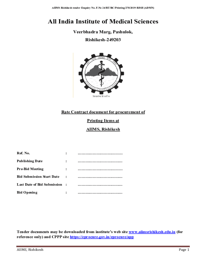 AIMS Rishikesh tender Inquiry No. F. No 24/RT/RC/Printing/278/2019RISH (ADEN)All India Institute of Medical Sciences Veerbhadra Mary, Passbook, Rishikesh249203Rate Contract document for procurement