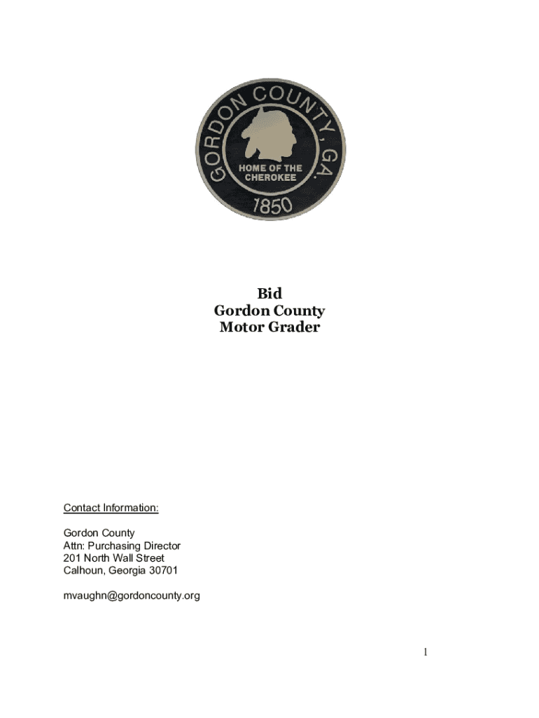 Bid Gordon County Motor GraderContact Information: Gordon County Attn: Purchasing Director 201 North Wall Street Calhoun, Georgia 30701 mvaughn@gordoncounty.org1TABLE of CONTENTS 1.0 Overview ..................................................................................................................