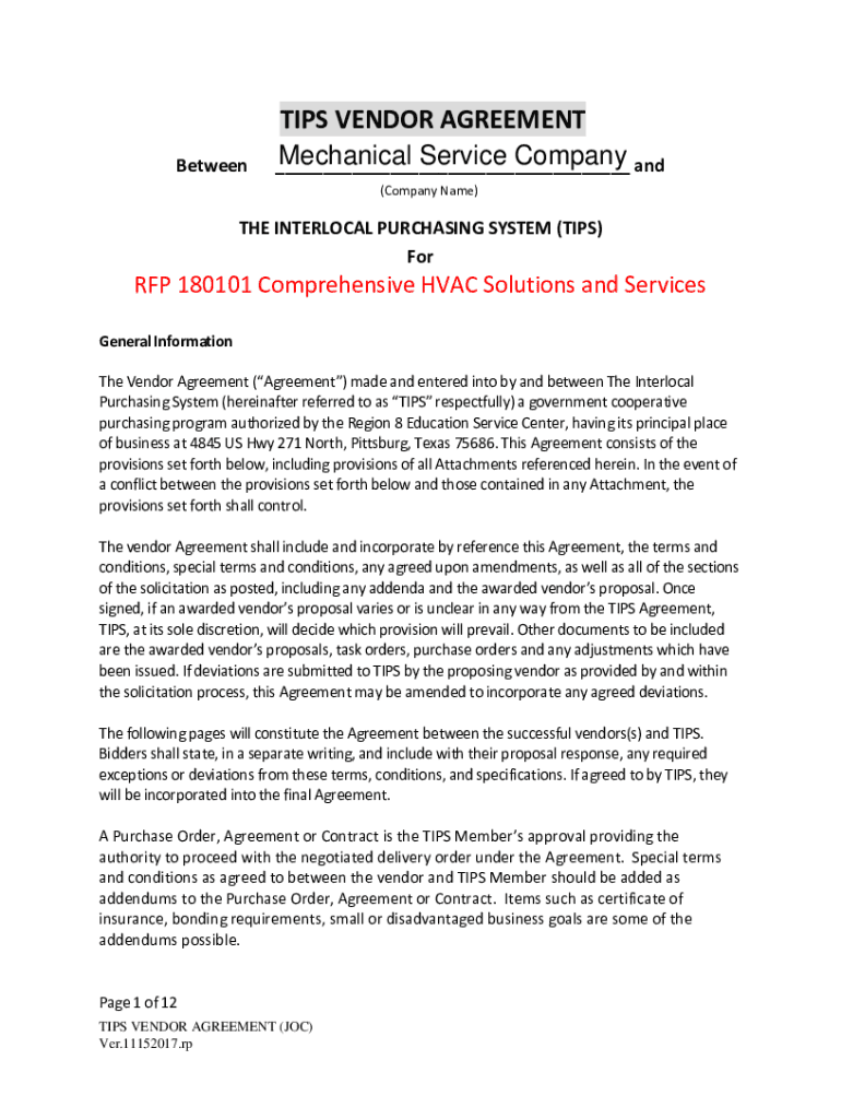 Betweenness VENDOR AGREEMENT Mechanical Service Company and ___ (Company Name)THE INTERLOCK PURCHASING SYSTEM (TIPS) For RFP 180101 Comprehensive HVAC Solutions and Services General Information The