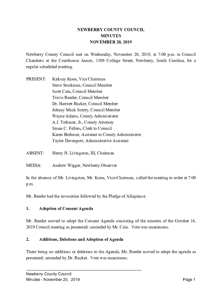 NEWBERRY COUNTY COUNCIL MINUTES NOVEMBER 20, 2019, Newberry County Council met on Wednesday, November 20, 2019, at 7:00 p.m. in Council Chambers at the Courthouse Annex, 1309 College Street, Newberry,