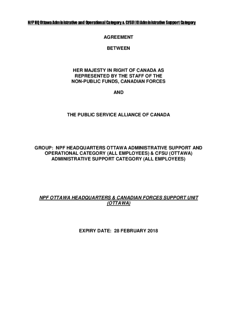 NFL HQ Ottawa Administrative and Operational Category & CSU (O) Administrative Support CategoryAGREEMENT BETWEEN HER MAJESTY IN RIGHT OF CANADA AS REPRESENTED BY THE STAFF OF THE NONPUBLIC FUNDS,