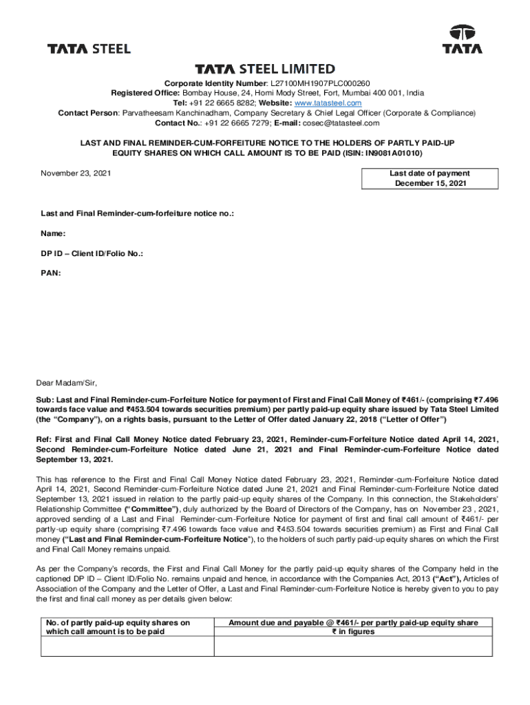 Get the free Registered Office Bombay House 24 Homi Mody ... - Tata Steel