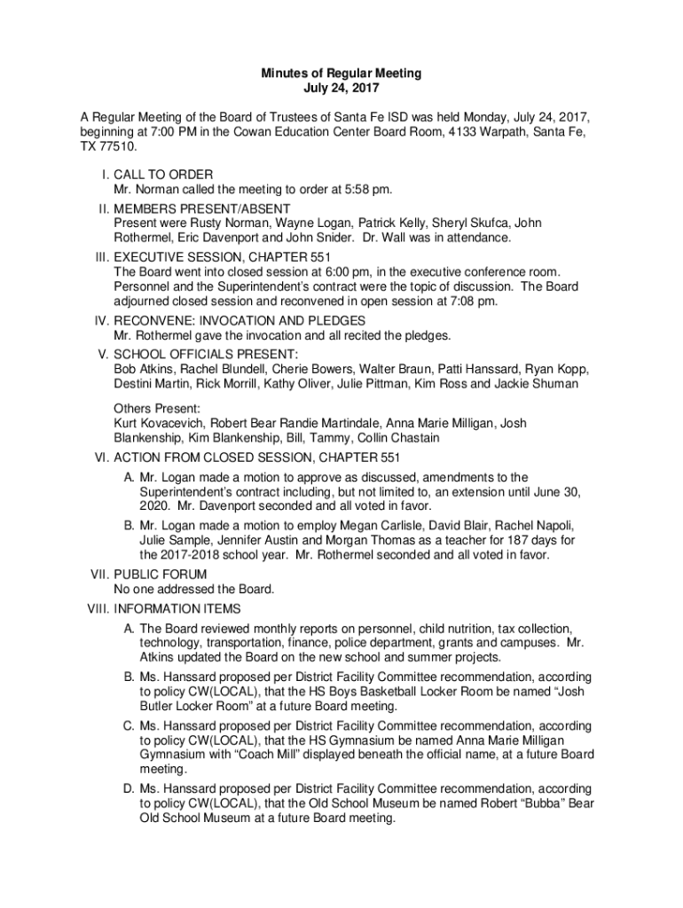 Minutes of Regular Meeting July 24, 2017, A Regular Meeting of the Board of Trustees of Santa Fe ISD was held Monday, July 24, 2017, beginning at 7:00 PM in the Conan Education Center Board Room,