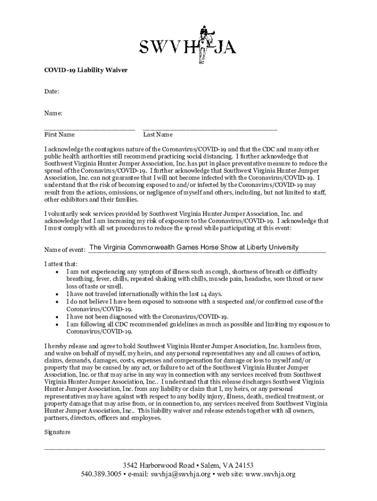 COVID-19 Liability Waiver Date: Name: ___ First Name___ Last Name acknowledge the contagious nature of the Coronavirus/COVID-19 and that the CDC and many other public health authorities still recommend