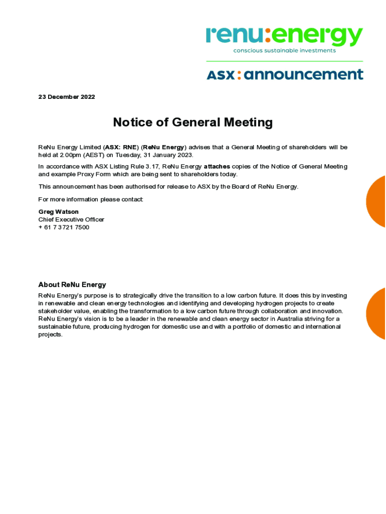 23 December 2022Notice of General Meeting Menu Energy Limited (ASX: RNE) (Menu Energy) advises that a General Meeting of shareholders will be held at 2.00pm (AEST) on Tuesday, 31 January 2023. In
