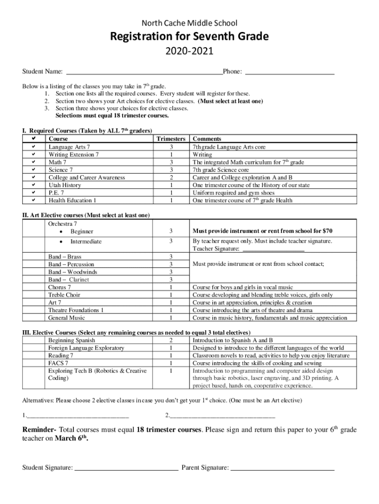 North Cache Middle SchoolRegistration for Seventh Grade 20202021 Student Name:Phone:Below is a listing of the classes you may take in 7th grade. 1. Section one lists all the required courses. Every