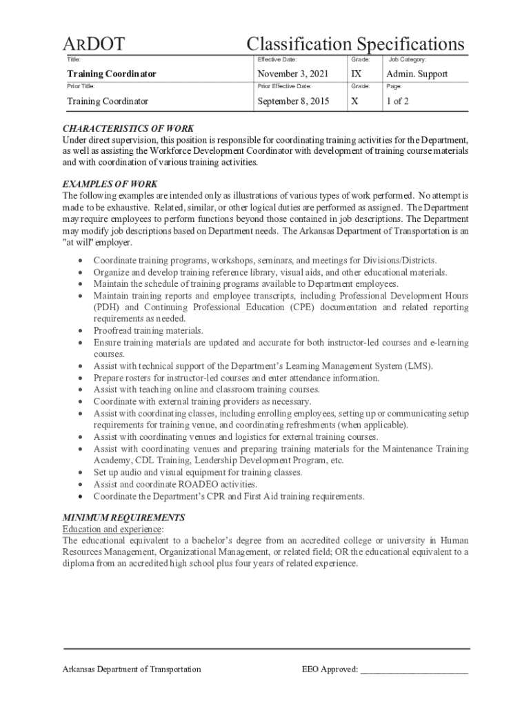 ARDOR Title:Classification Specifications Effective Date:Grade:Job Category:Training Coordinator November 3, 2021IXAdmin. SupportPrior Title:Prior Effective Date:Grade:Page:Training Coordinator September