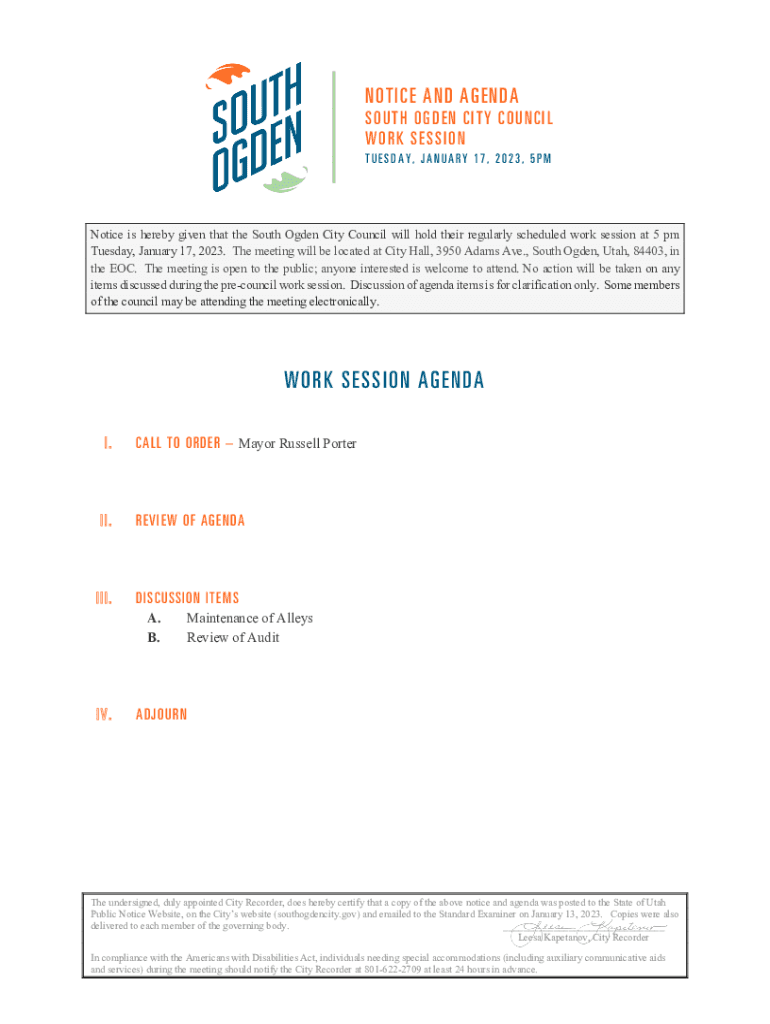 NOTICE AND AGENDASOUTH OGDEN CITY COUNCIL WORK SESSION TUESDAY, JANUARY 17, 2023, 5PMNotice is hereby given that the South Ogden City Council will hold their regularly scheduled work session at 5