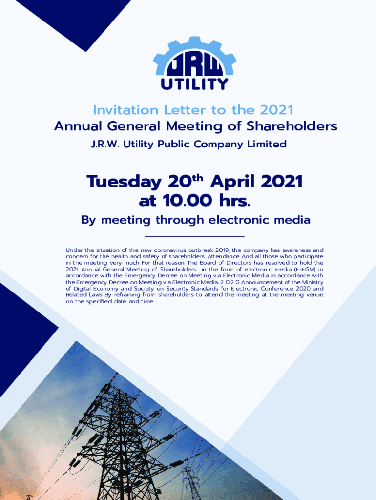 Invitation Letter to the 2021 Annual General Meeting of Shareholders J.R.W. Utility Public Company Limited Tuesday 20th April 2021 at 10.00 hrs. By meeting through electronic media Under the situation