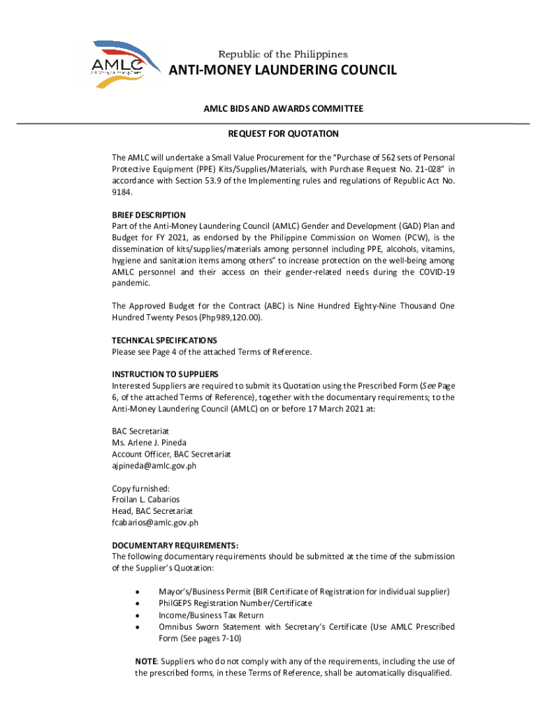 Republic of the PhilippinesANTIMONEY LAUNDERING COUNCIL AMC BIDS AND AWARDS COMMITTEE REQUEST FOR QUOTATION The AMC will undertake a Small Value Procurement for the Purchase of 562 sets of Personal