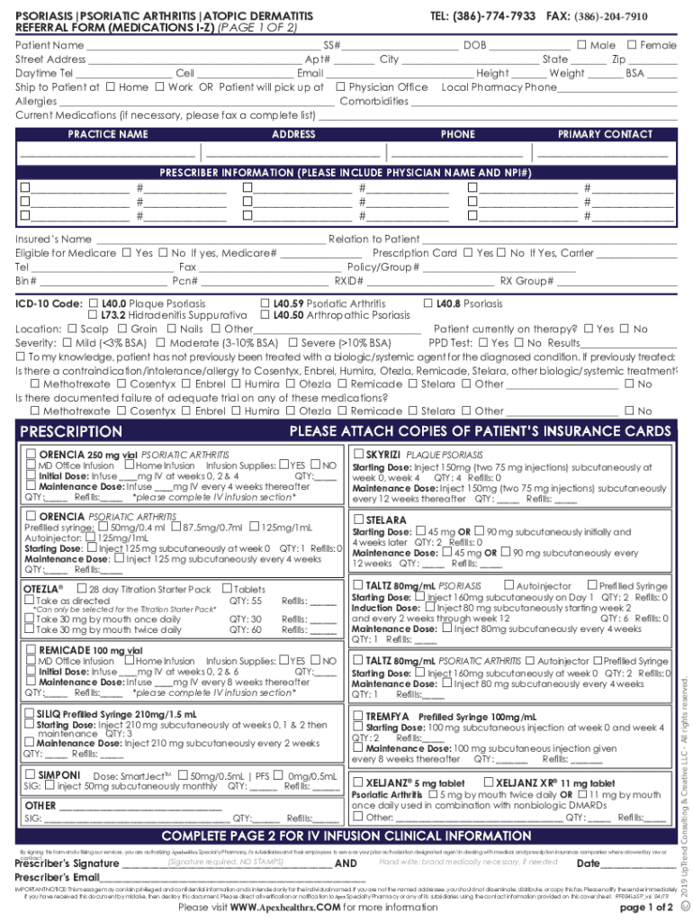TEL: (386)7747933 FAX: (386)2047910PSORIASIS|PSORIASIS ARTHRITIS|ATOMIC DERMATITIS REFERRAL FORM (MEDICATIONS IZ) (PAGE 1 OF 2)Patient Name ___ SS#___ DOB ___ Male Female Street Address ___ Apt# ___