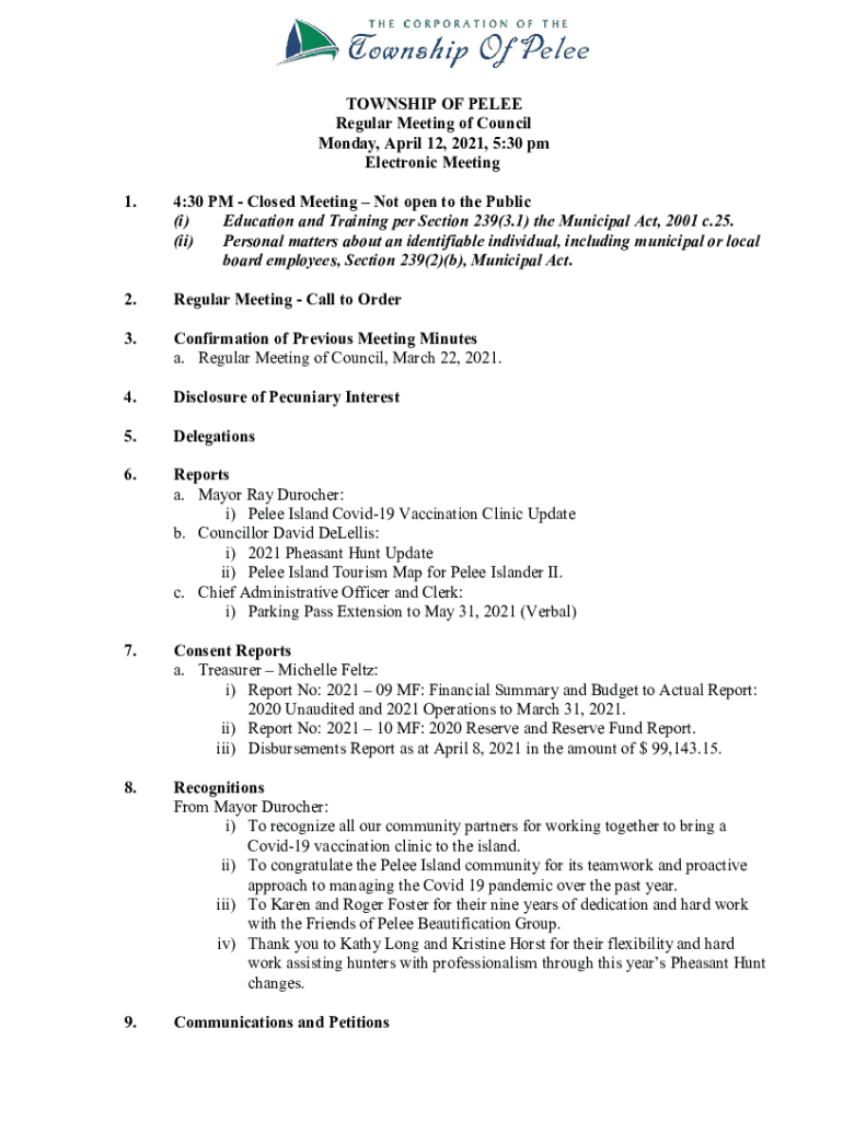 TOWNSHIP OF PELEE Regular Meeting of Council Monday, April 12, 2021, 5:30 pm Electronic Meeting 1.4:30 PM Closed Meeting Not open to the Public (i) Education and Training per Section 239(3.1) the