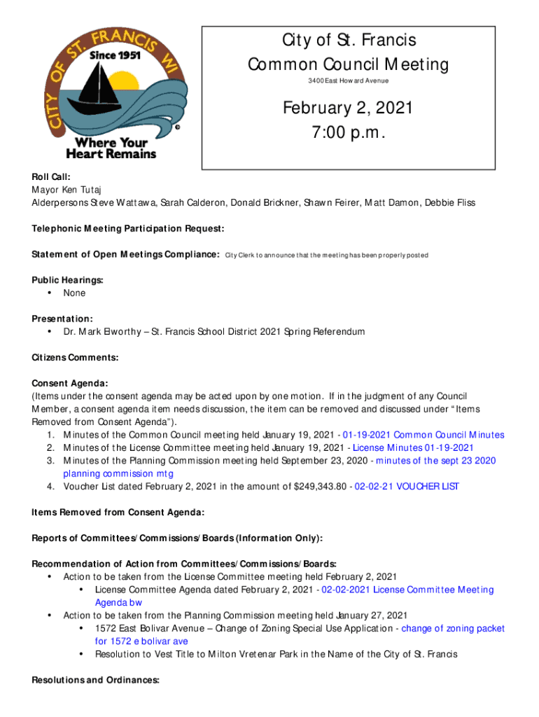 City of St. Francis Common Council Meeting 3400 East Howard Avenue February 2, 2021 7:00 p.m. Roll Call: Mayor Ken Total Alder persons Steve Ottawa, Sarah Calderon, Donald Bruckner, Shawn Career,
