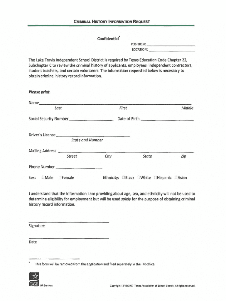 CRIMINAL HISTORY INFORMATION REQUESTConfidential POSITION: _ _ _ _ _ _ _ _ __ LOCATION: _ _ _ _ _ _ _ _ __The Lake Travis Independent School District is required by Texas Education Code Chapter 22,