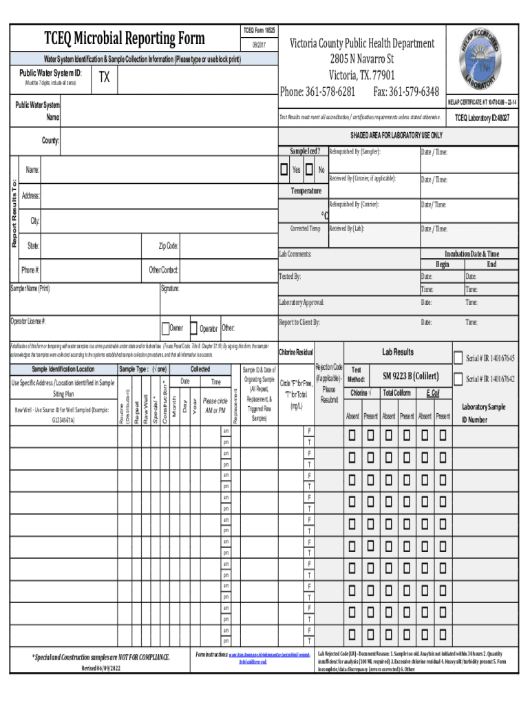 CEQ Form 10525TCEQ Microbial Reporting Form08/2017Water System Identification & Sample Collection Information (Please type or use block print) Public Water System ID: (Must be 7 digits; include all