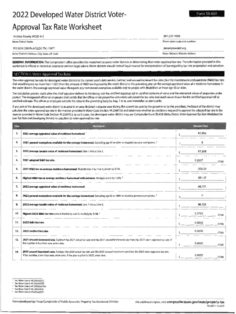 2022 Developed Water District Perform 50860Approval Tax Rate Worksheet 361 2371066Victoria County ACID # 2Phone (area code and number)Water District Nameplacedotxwcid2.org PO BOX 238 PLACED TX 77977Water