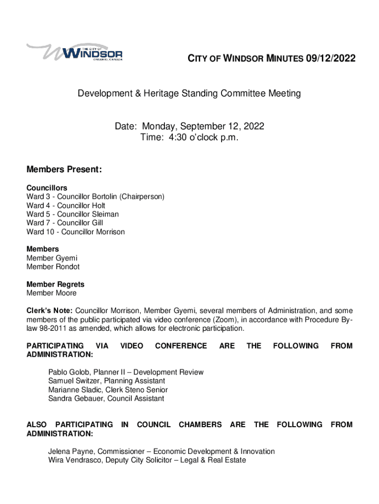 CITY OF WINDSOR MINUTES 09/12/2022Development & Heritage Standing Committee MeetingDate: Monday, September 12, 2022, Time: 4:30. Members Present: Councillors Ward 3 Councillor Borodin (Chairperson)