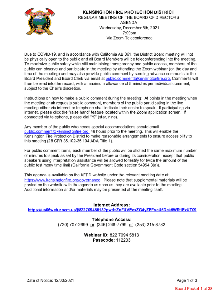 KENSINGTON FIRE PROTECTION DISTRICTREGULAR MEETING OF THE BOARD OF DIRECTORS AGENDA Wednesday, December 8th, 2021 7:00pm Via Zoom Teleconferenced to COVID-19, and in accordance with California AB