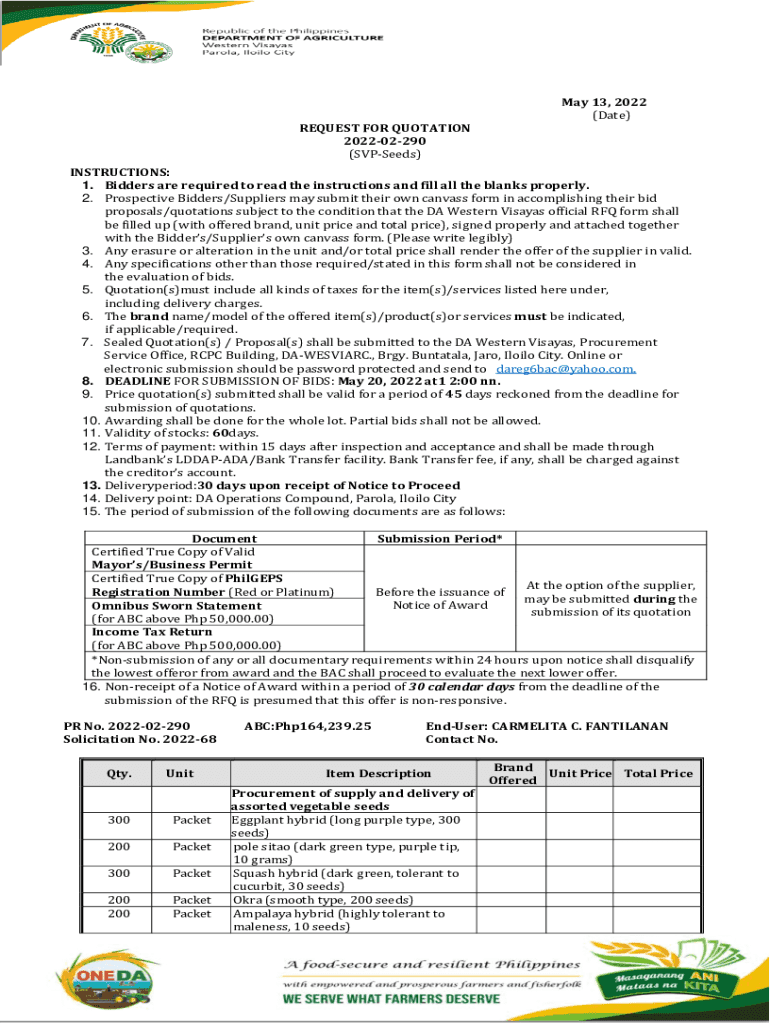 May 13, 2022 (Date) REQUEST FOR QUOTATION 202202290 (Speeds) INSTRUCTIONS: 1. Bidders are required to read the instructions and fill all the blanks properly. 2. Prospective Bidders/Suppliers may submit