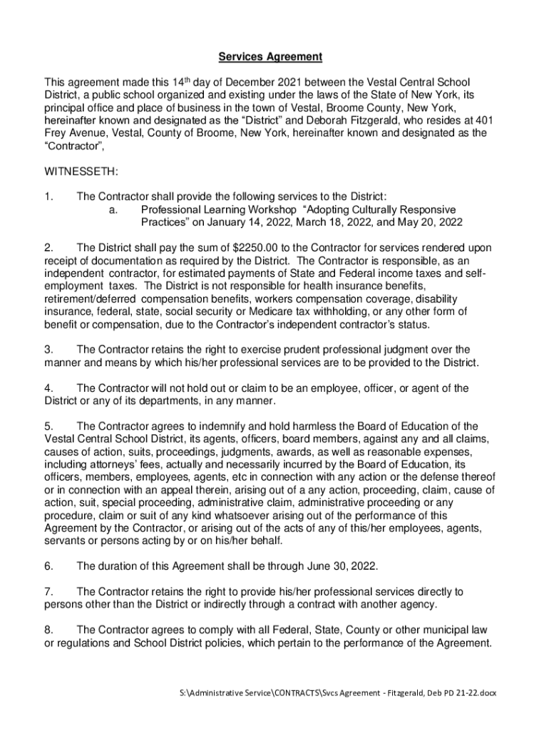 Services Agreement This agreement made this 14th day of December 2021 between the Vestal Central School District, a public school organized and existing under the laws of the State of New York, its