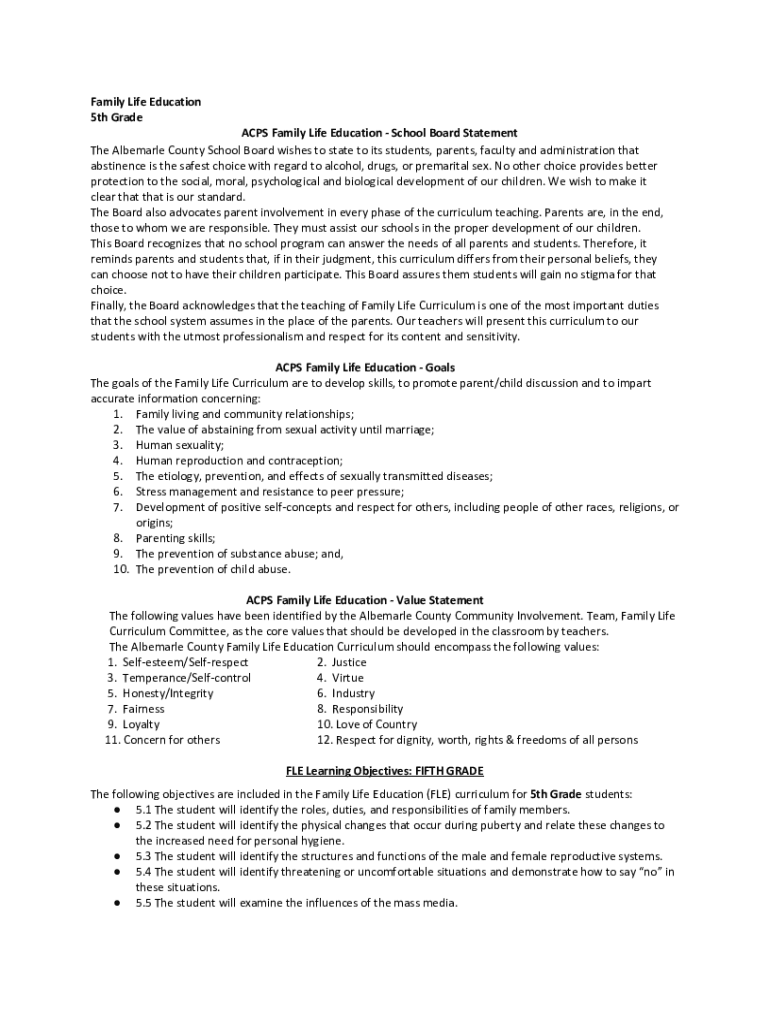 Family Life Education 5th Grade ACTS Family Life Education School Board Statement The Albemarle County School Board wishes to state to its students, parents, faculty and administration that abstinence