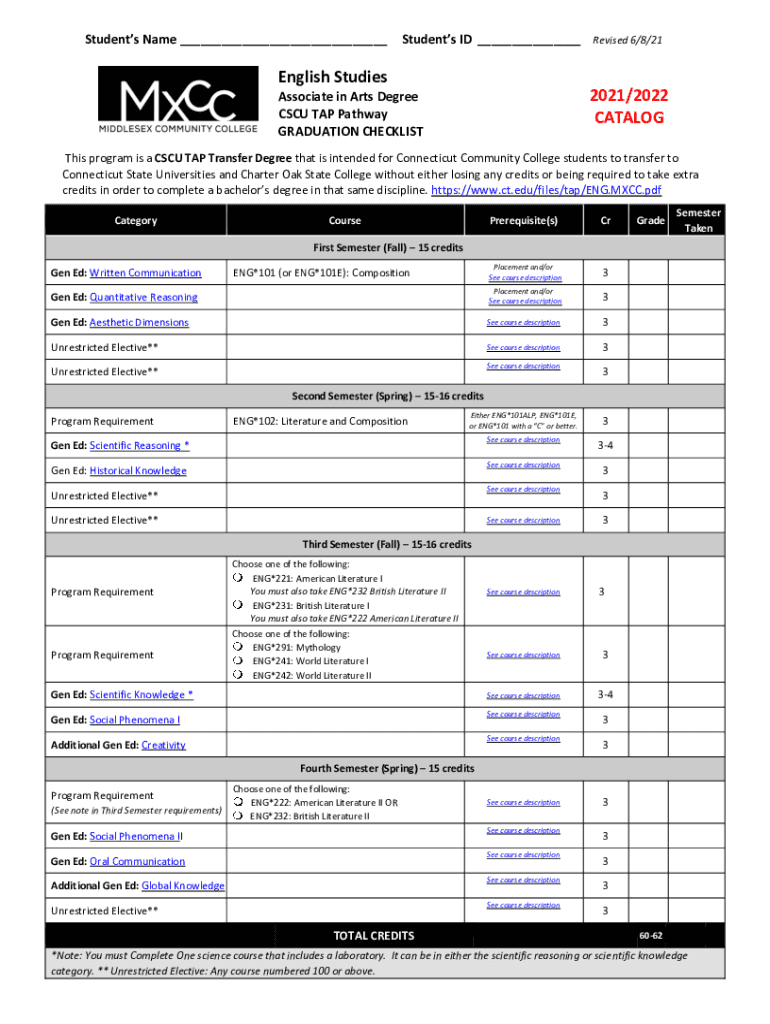 Students Name ___Students ID ___ Revised 6/8/21English Studies2021/2022 CATALOGAssociate in Arts Degree CSU TAP Pathway GRADUATION Checklists program is a CSU TAP Transfer Degree that is intended