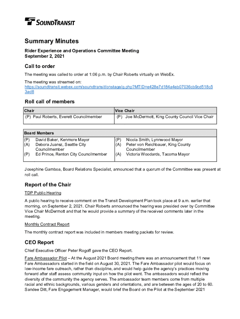 Summary Minutes Rider Experience and Operations Committee Meeting September 2, 2021Call to order The meeting was called to order at 1:06 p.m. by Chair Roberts virtually on WebEx. The meeting was streamed