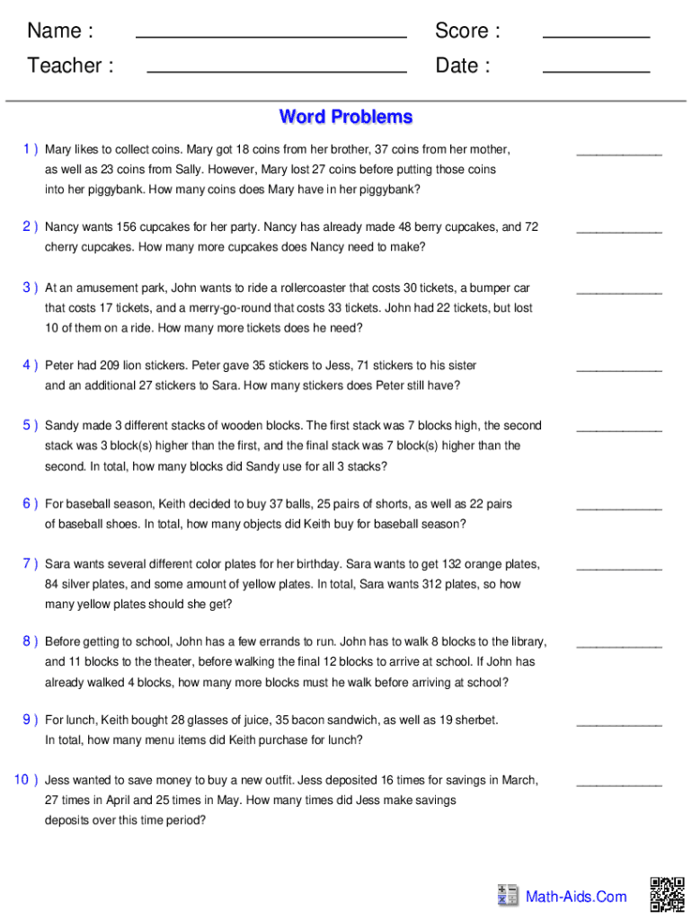 Name :Score :Teacher :Date : Word Problems1) Mary likes to collect coins. Mary got 18 coins from her brother, 37 coins from her mother, ___as well as 23 coins from Sally. However, Mary lost 27 coins