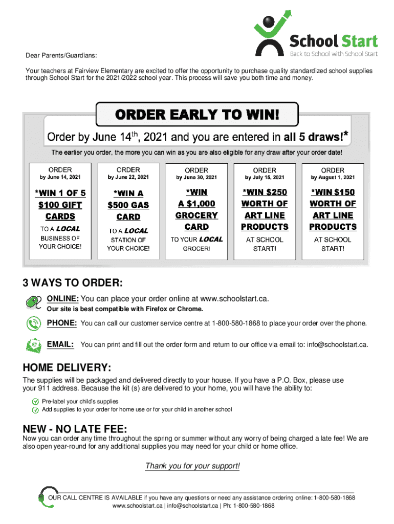 Dear Parents/Guardians: Your teachers at Fairview Elementary are excited to offer the opportunity to purchase quality standardized school supplies through School Start for the 2021/2022 school year.