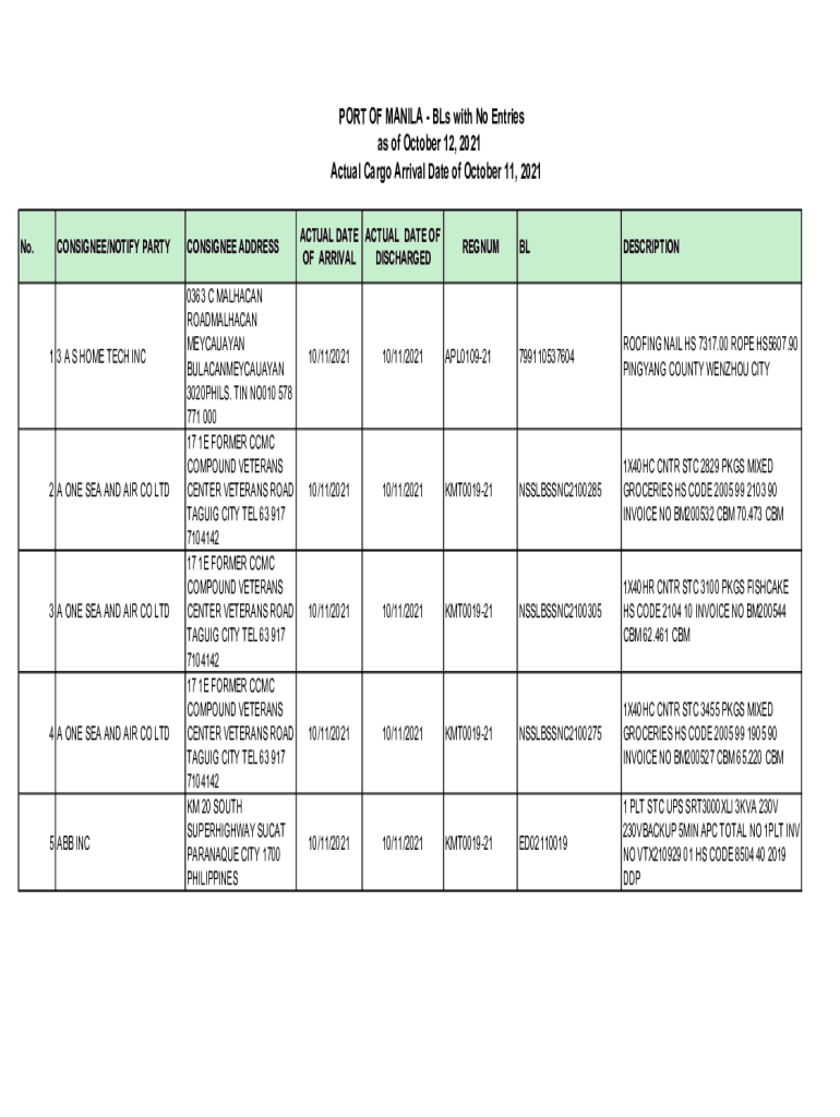 PORT OF MANILA BLS with No Entries as of October 12, 2021, Actual Cargo Arrival Date of October 11, 2021 No.CONSIGNEE/NOTIFY PARTY1 3 A S HOME TECH INC2 A ONE SEA AND AIR CO LTD3 A ONE SEA AND AIR