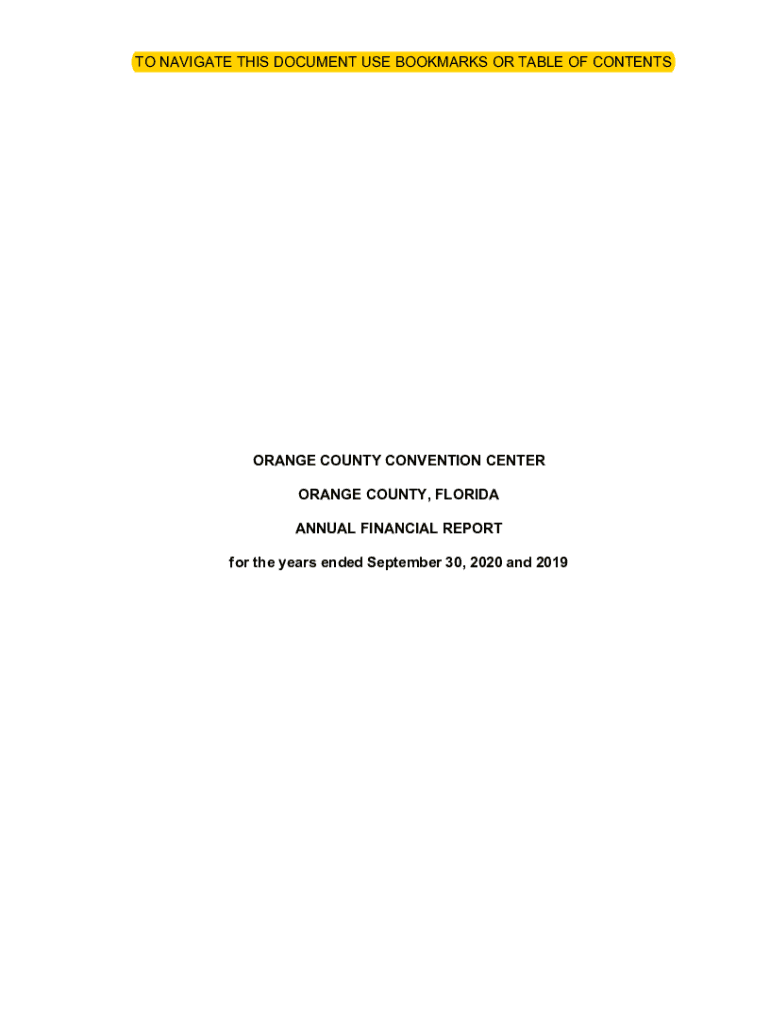 TO NAVIGATE THIS DOCUMENT USE BOOKMARKS OR TABLE OF CONTENTSORANGE COUNTY CONVENTION CENTER ORANGE COUNTY, FLORIDA ANNUAL FINANCIAL REPORT for the years ended September 30, 2020, and 2019ORANGE COUNTY