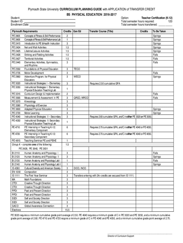 Plymouth State University CURRICULUM PLANNING GUIDE with APPLICATION of TRANSFER CREDIT Student: Student ID: Enrollment Date: Plymouth Requirements PE 2405 PE 2406 PE 2415 PE 2424 PE 2425 PE 2426