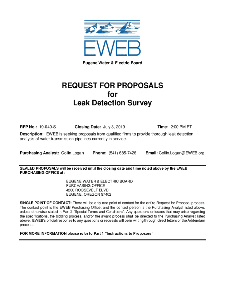 Eugene Water & Electric BoardREQUEST FOR PROPOSALS for Leak Detection Survey RFP No.: 19040SClosing Date: July 3, 2019Time: 2:00 PM Description: WEB is seeking proposals from qualified firms to provide
