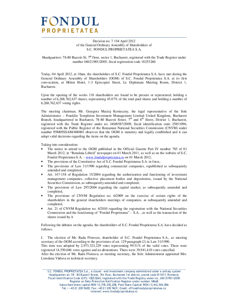 ___ Decision no. 7 / 04 April 2012 of the General Ordinary Assembly of Shareholders of S.C. FONDUE PROPRIETARY S.A. Headquarters: 7880 Best St, 7th floor, sector 1, Bucharest, registered with the