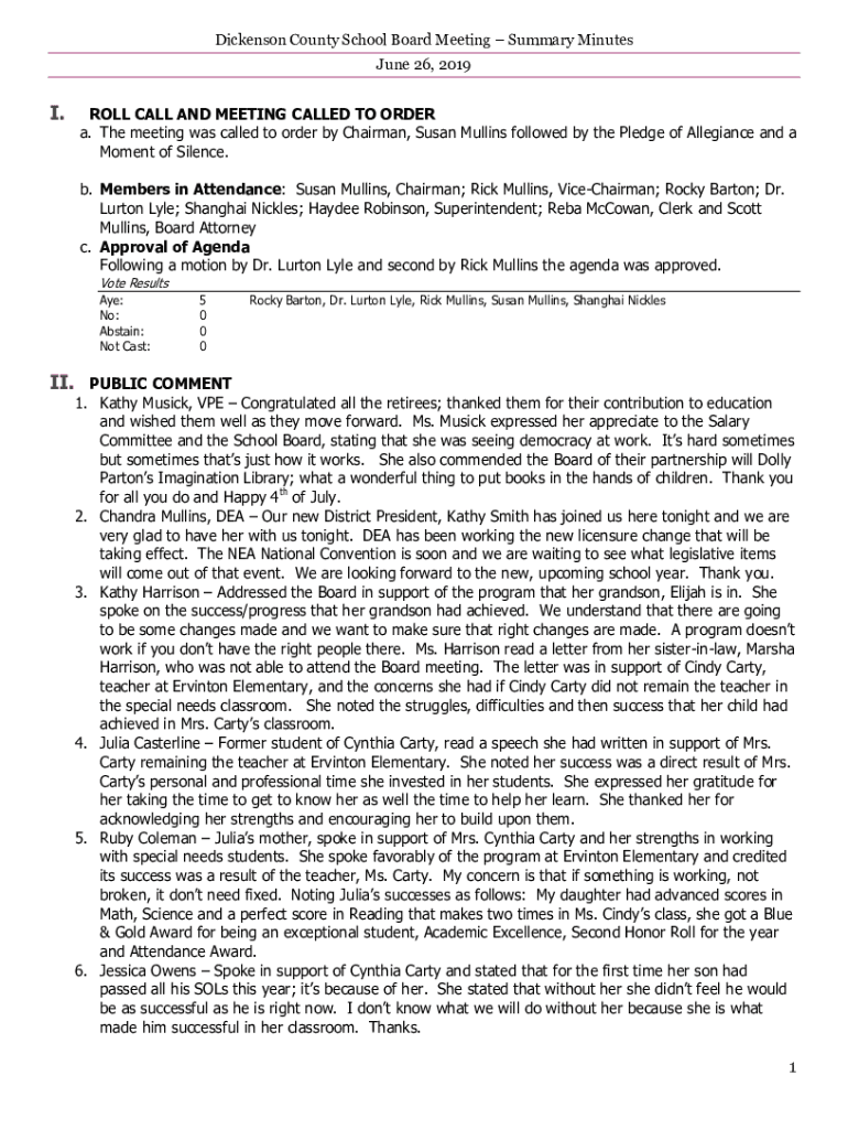 Dickinson County School Board Meeting Summary Minutes June 26, 2019I.ROLL CALL AND MEETING CALLED TO ORDER a. The meeting was called to order by Chairman, Susan Mullins followed by the Pledge of Allegiance