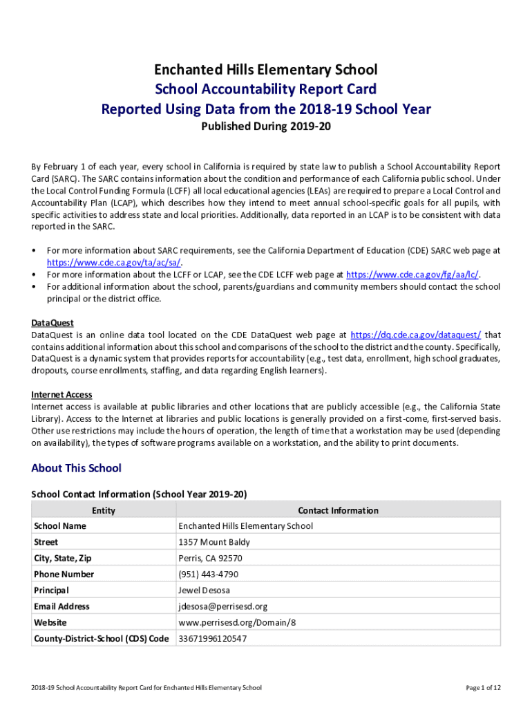 Enchanted Hills Elementary School Accountability Report Card Reported Using Data from the 201819 School Year Published During 201920 By February 1 of each year, every school in California is required