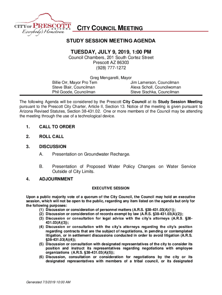 CITY COUNCIL MEETING STUDY SESSION MEETING AGENDA TUESDAY, JULY 9, 2019, 1:00 PM Council Chambers, 201 South Cortez Street Prescott AZ 86303 (928) 7771272 Greg Mentally, Mayor Billie Orr, Mayor Pro