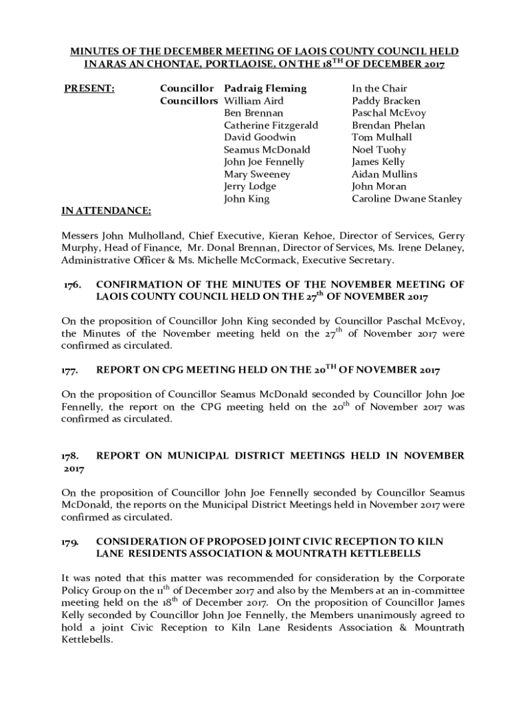 MINUTES OF THE DECEMBER MEETING OF LAOS COUNTY COUNCIL HELD IN ARAS AN CHOCTAW, TORTOISE, ON THE 18TH OF DECEMBER 2017 PRESENT:Councillor Paddies Fleming Councillors William Air Ben Brennan Catherine