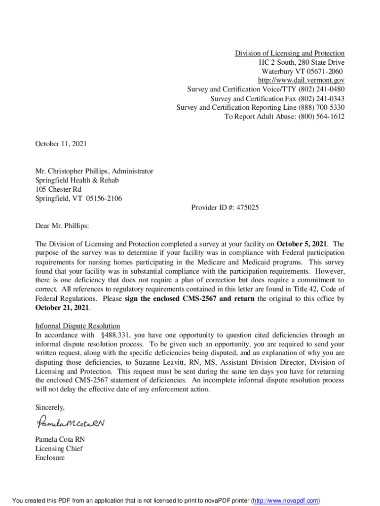 Division of Licensing and Protection HC 2 South, 280 State Drive Waterbury VT 056712060 http://www.dail.vermont.gov Survey and Certification Voice/TTY (802) 2410480 Survey and Certification Fax (802)