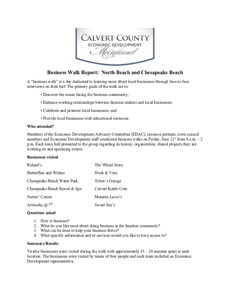 Business Walk Report: North Beach and Chesapeake Beach A business walk is a day dedicated to learning more about local businesses through facetoface interviews on their turf. The primary goals of