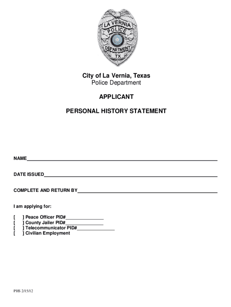 City of La Hernia, Texas Police Department APPLICANT PERSONAL HISTORY STATEMENTNAMEDATE ISSUEDCOMPLETE AND RETURN BYI am I applying for: [[[[] Peace Officer PID#___] County Jailer PID#___] Telecommunication