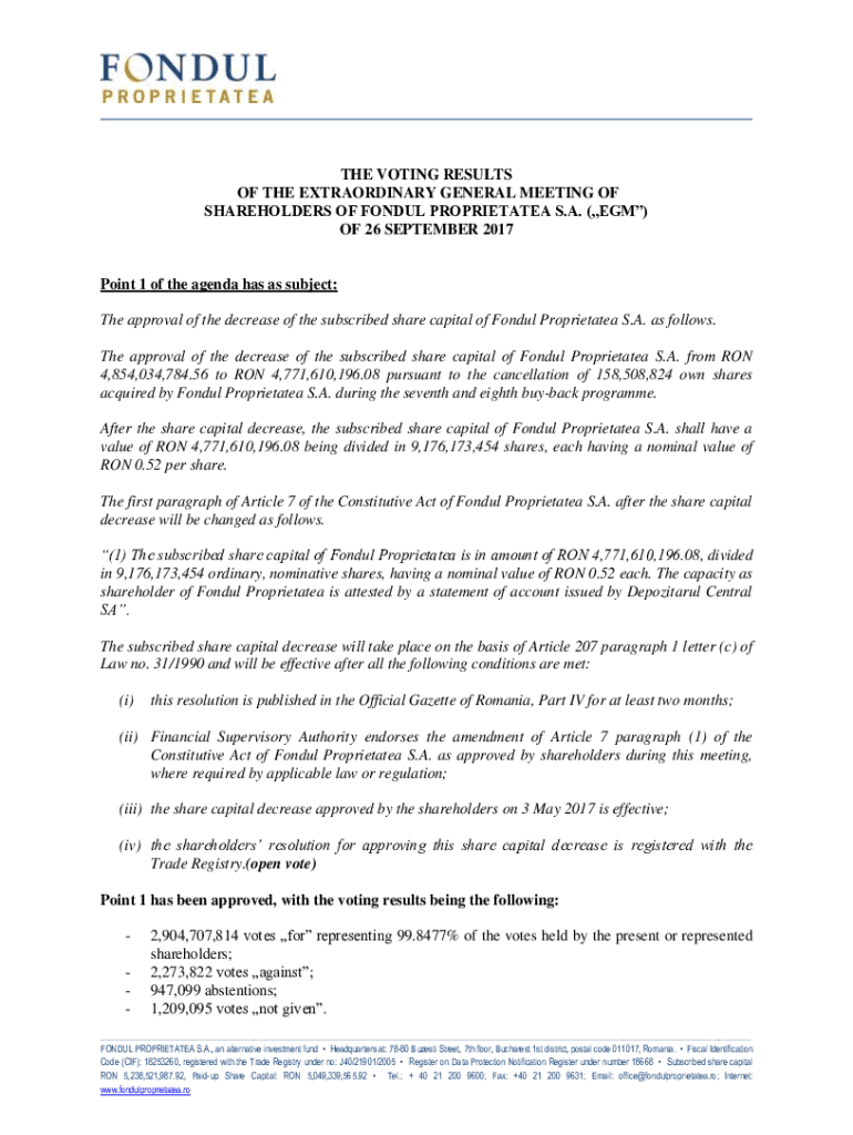 THE VOTING RESULTS OF THE EXTRAORDINARY GENERAL MEETING OF SHAREHOLDERS OF FONDUE PROPRIETARY S.A. (EGG) OF 26 SEPTEMBER 2017Point 1 of the agenda has as subject: The approval of the decrease of the