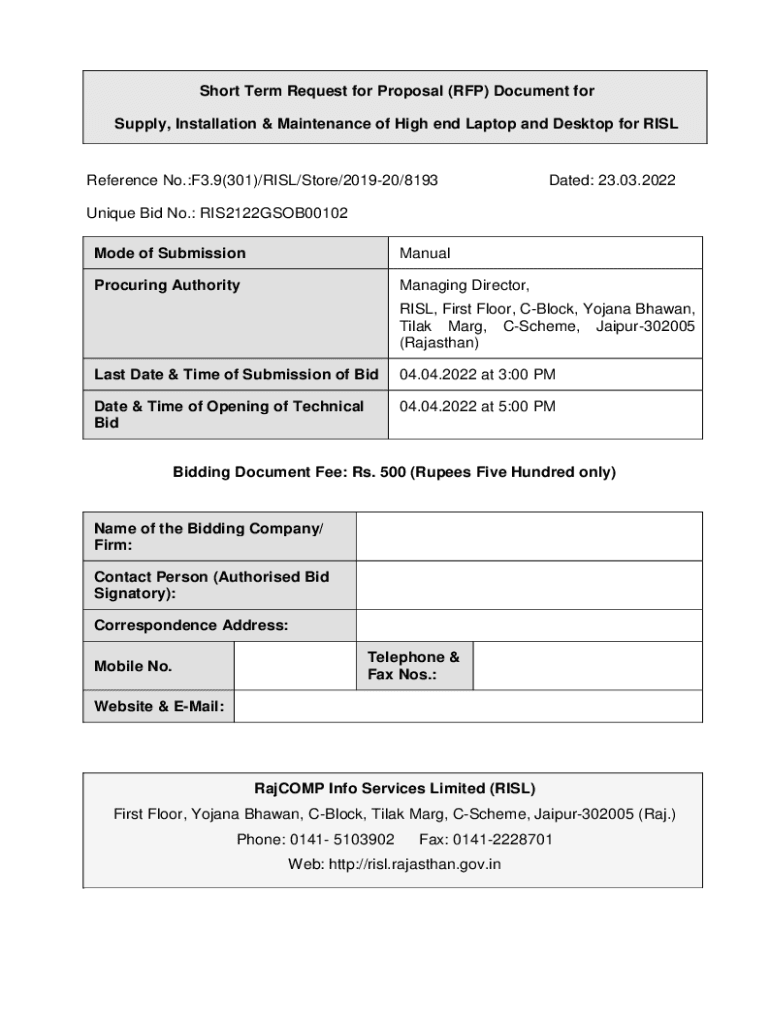 Supply, Installation & Maintenance of High-end Laptop and Desktop for RISLReference No.:F3.9(301)/RISE/Store/201920/8193Dated: 23.03.2022Unique Bid