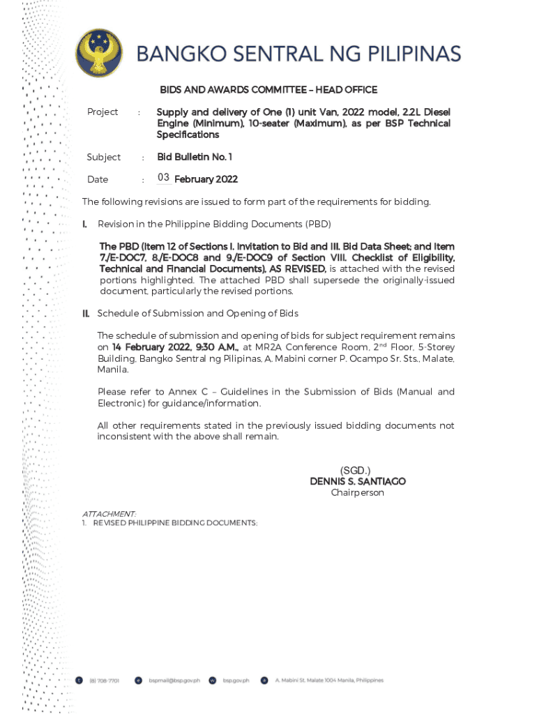 BIDS AND AWARDS COMMITTEE HEAD OFFICE Project:Supply and delivery of One (1) unit Van, 2022 model, 2.2L Diesel Engine (Minimum), 10seater (Maximum), as per BSP Technical SpecificationsSubject:Bid