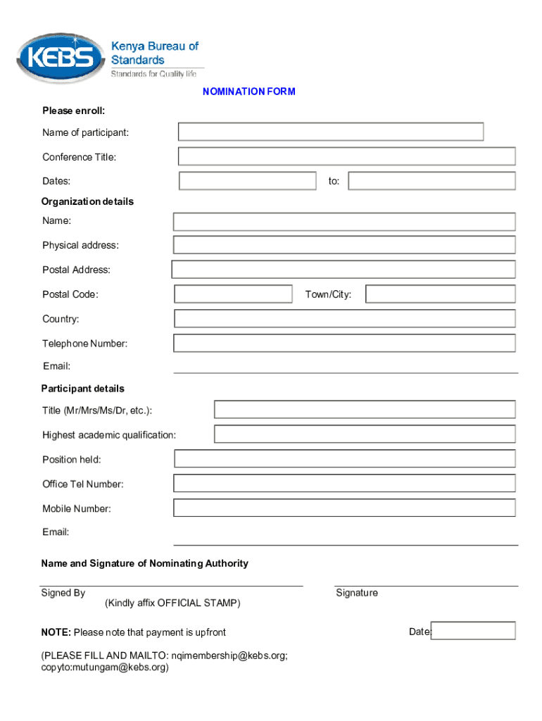 NOMINATION FORM Please enroll: Name of participant: Conference Title: Dates:to:Organization details Name: Physical address: Postal Address: Postal Code:Town/City:Country: Telephone Number: Email: