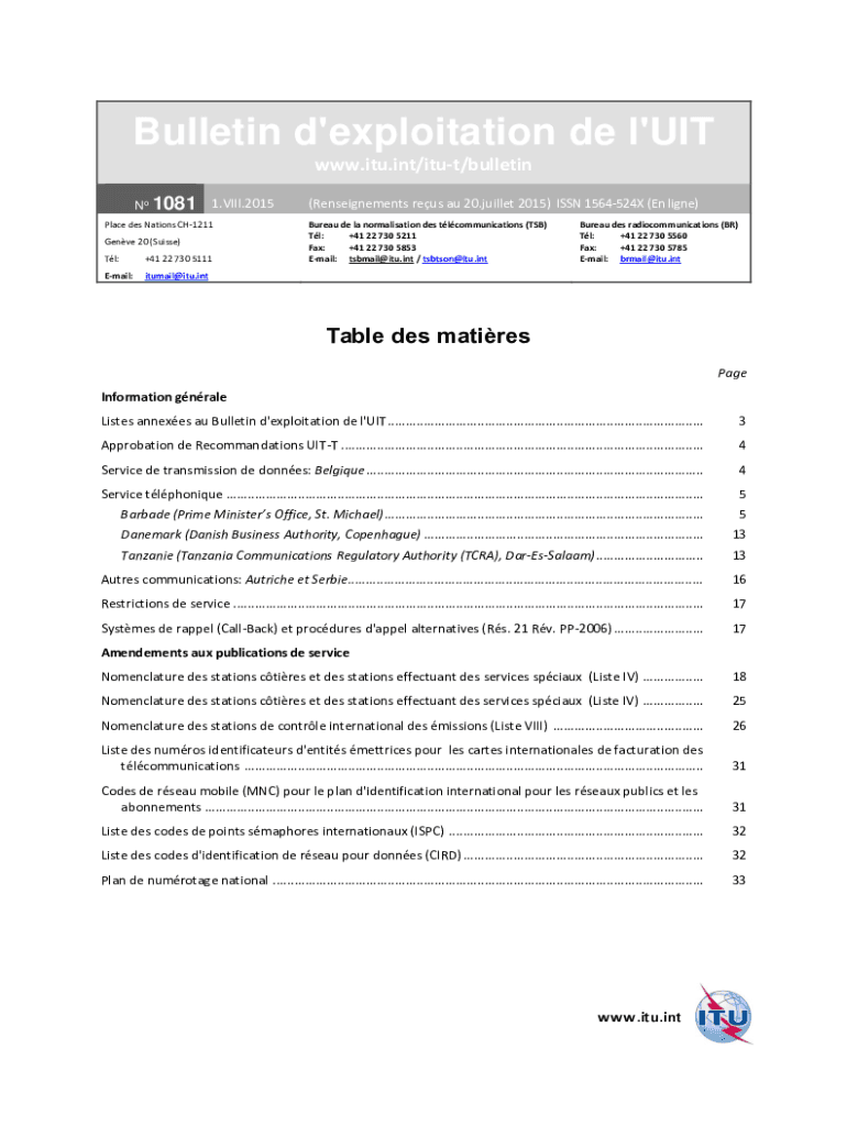 Bulletin d\'exploitation de l\'UIT www.itu.int/itut/bulletin No 10811.VIII.2015Place DES Nations CH1211 Genre 20 (Swiss) Tl:+41 22 730 5111Email:itumail@itu.int(Restatements Zeus AU 20.bullet 2015)