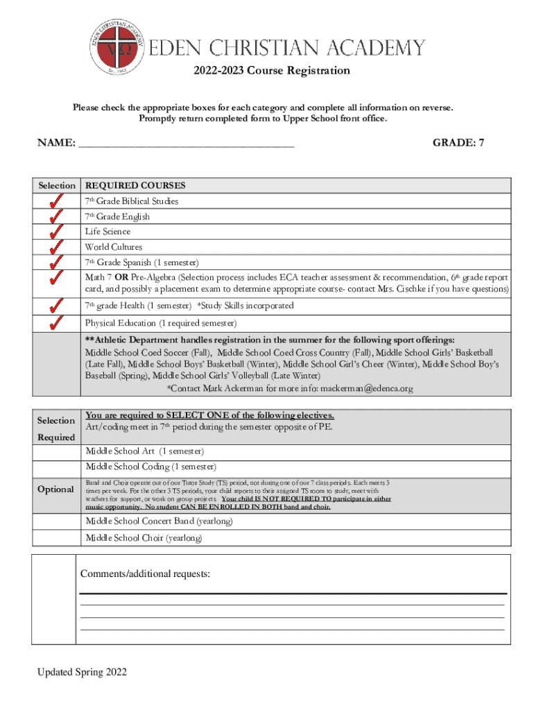 20222023 Course Registration Please check the appropriate boxes for each category and complete all information on reverse. Promptly return completed form to Upper School front office.NAME: ___ SelectionGRADE: